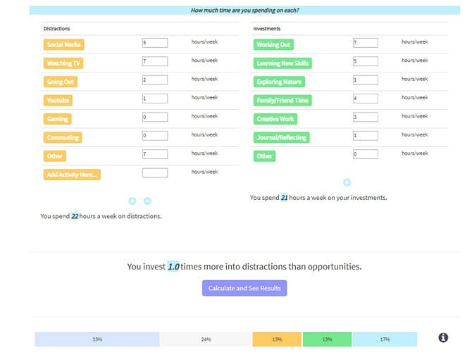 Ovaj besplatni kalkulator uzima ideju vremena i usitnjava ga u detalje, slično kao i prethodni, za one kojima treba dodatna pomoć. Osmišljen je kako bi se odrazio na izbor životnog stila i vrijeme koje trošite. Svaki okvir također navodi približne sate tjedno koje prosječna osobe troši na svaku aktivnost. Možete unijeti i vlastite aktivnosti.