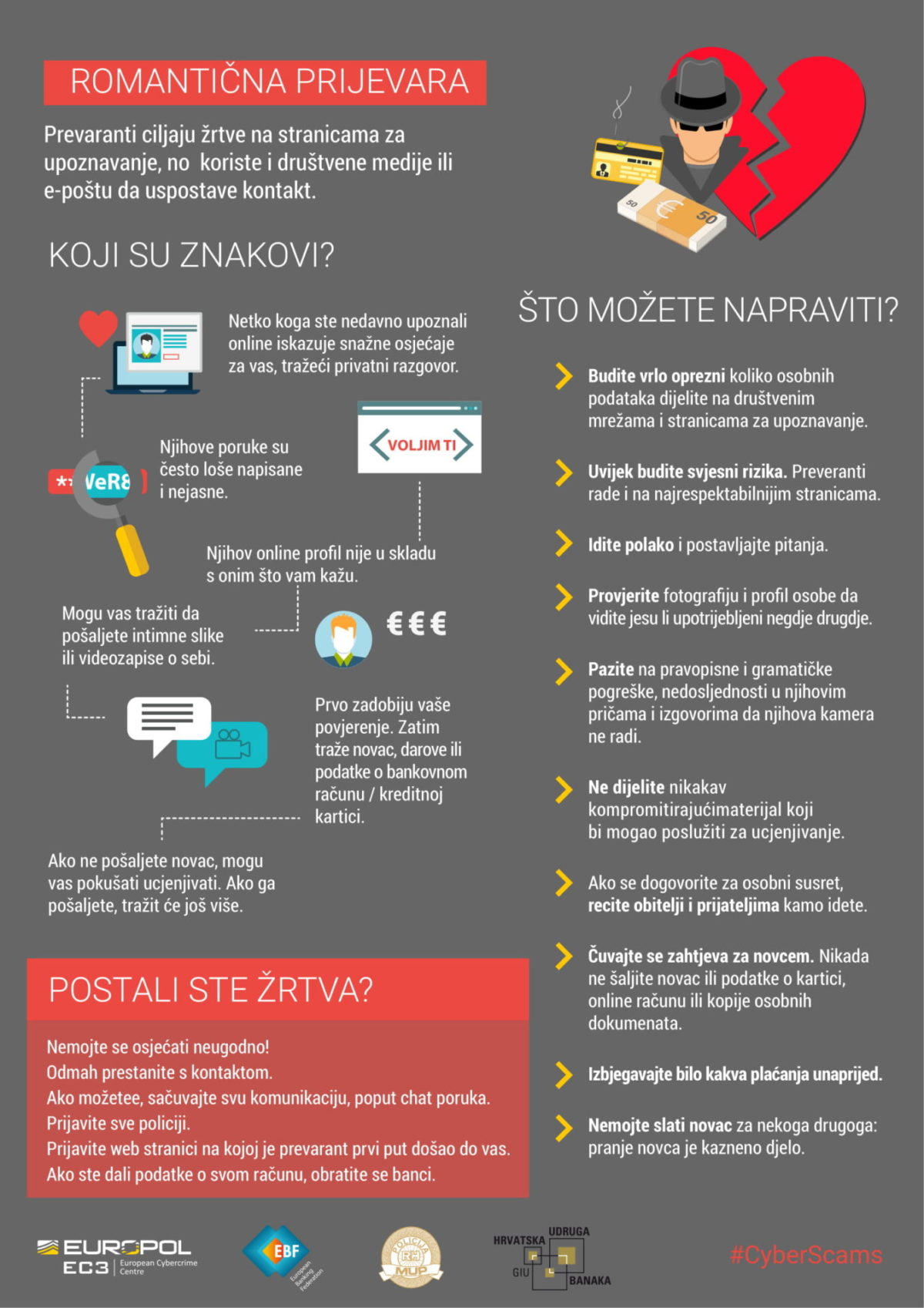 Kako romantične prijevare funkcioniraju? Počinitelji tzv. romantičnih prijevara kroz komunikaciju iskazuju snažne osjećaje prema žrtvi, a nakon što zadobiju njeno povjerenje, traže novac, darove, podatke o bankovnim karticama ili kriptovalute. Također, mogu tražiti i da im žrtva pošalje intimne fotografije ili videozapise.