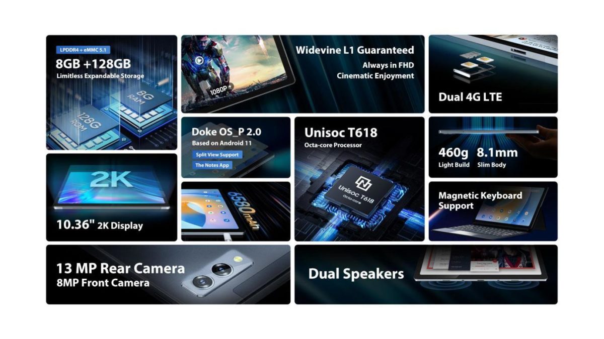 Tijekom trajanja ove velike rasprodaje, u ponudi se nalazi Blackview Tab 11, prvi high-end Blackview vodeći model koji može zamijeniti laptop ili pametni telefon, a iznimno je koristan za posao, učenje i rekreaciju. Uz 10,36-inčni 2K zaslon, Widevine L1 certifikat i dual BOX zvučnike, Tab 11 pruža vrhunski audio i vizualni užitak. Uređaj napaja baterija od 6580 mAh, a krasi ga mid-end Unisoc T618 čip s 8 GB RAM-a i 128 GB ROM-a. Specifikacije koje ispunjavaju zahtjeve za dugotrajan rad ili gaming. Najnoviji Doke OS_P 2.0 temeljen na Android 11 i vanjska podrška za tipkovnicu podižu učinkovitost i produktivnost na novu razinu. Tablet dolazi s dvostrukim utorima za kartice pa možete staviti dvije 4G SIM kartice ili dodati TF karticu za proširenje do 1 TB memorije.
