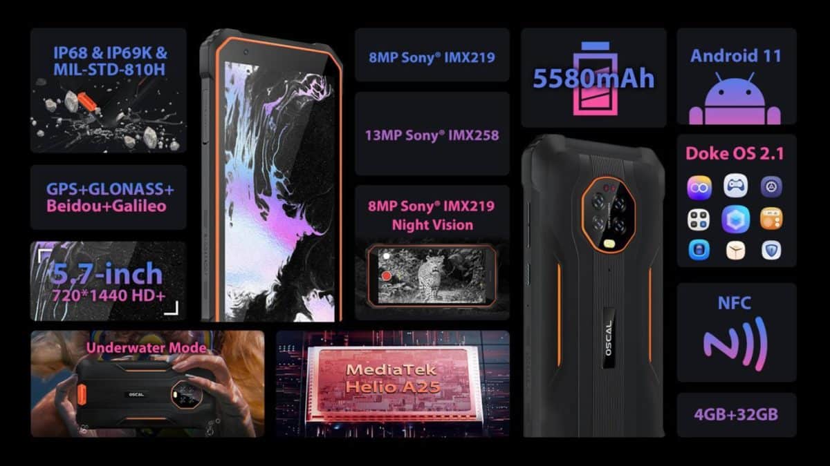 Prvi je nedavno lansirani OSCAL S60 Pro koji službeno stiže na tržište u ovoj ponudi, a opremljen je 8MP IR night vision kamerom. Iako je većina mobitela te kategorije prilično skupa, S60 PRO savršen je za korisnike koji imaju ograničeni budžet, a zanima ih night vision funkcija. Uz prednju kameru od 8 MP i stražnju od 13 MP koja podržava podvodni način rada, lako je snimati fotografije danju i noću, pod vodom ili na kopnu. Osim kamera, još jedna stvar koju ne možete zanemariti je impresivna izvedba koju donose osmojezgreni MediaTek Helio A25 s 4 GB RAM-a, 32 GB ROM-a i do 1 TB proširivog prostora za pohranu te Doke OS 2.1. Ispod kućišta telefona se, također, nalazi baterija od 5580 mAh koja osigurava neprekidno napajanje za kontinuiranu upotrebu. Ipak, ne smijemo izostaviti najvažniju činjenicu, a to je da je robusna izdržljivost testirana u najizazovnijim okruženjima, što svakako svrstava ovaj mobitel u pouzdane uređaje.