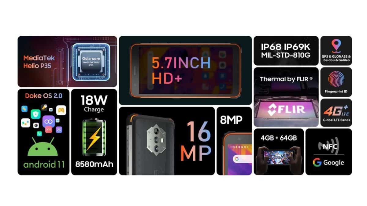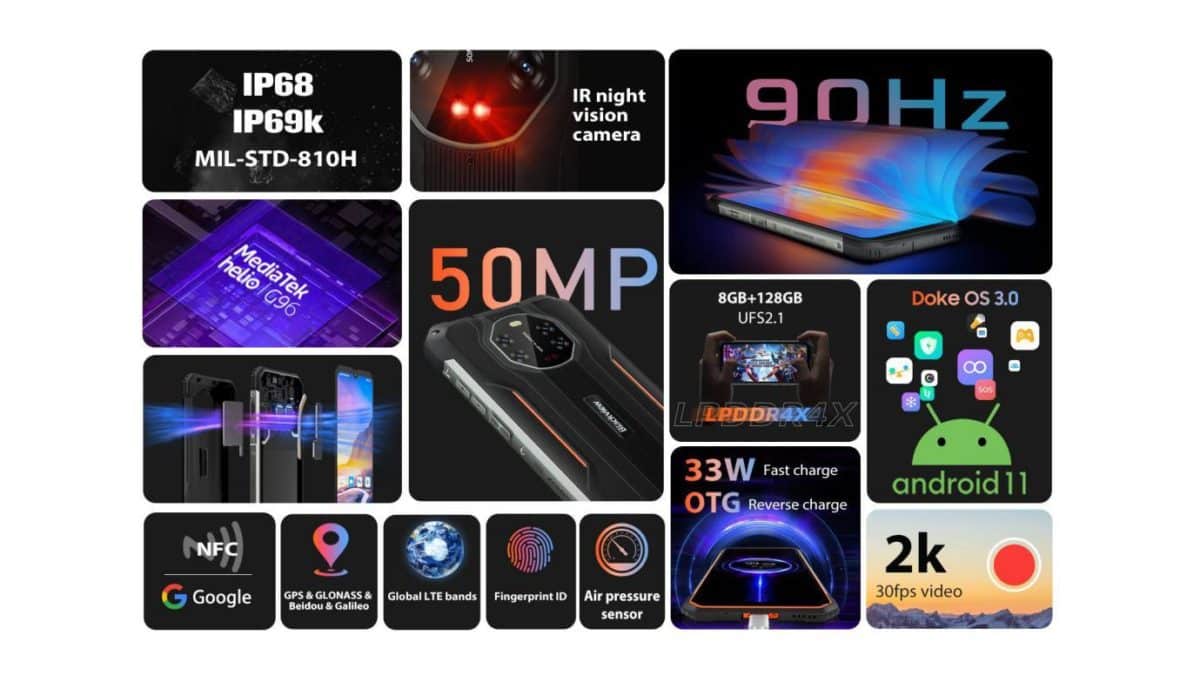 Blackview BV8800 još je jedan robusni telefon s night vision opcijom. U odnosu na OSCAL S60 Pro, donosi ogroman pomak u specifikacijama. BV8800 ima sustav kamera koji uključuje 50 MP Samsung ISOCELL JN1, 20 MP Sony IMX376 IR night vision, 8 MP 117° ultra-široku kameru i 16 MP Samsung ISOCELL 3P9 prednju kameru. Nadalje, to je prvi Blackview robusni mobitel s brzinom osvježavanja od 90 Hz koja mu omogućuje fluidni zaslon. Također, mobitel koristi najnoviji Doke OS 3.0. Naravno, ne treba zaboraviti spomenuti da mobitel ima ugrađen vrhunski MediaTek Helio G96 s 8 GB LPDDR4X RAM-a i UFS 2.1. 128 GB ROM-a, što mu je na AnTuTu ljestvici omogućilo rezultat od 301167. Uređaj napaja baterija od 8380 mAh s brzim punjenjem od 33 W.