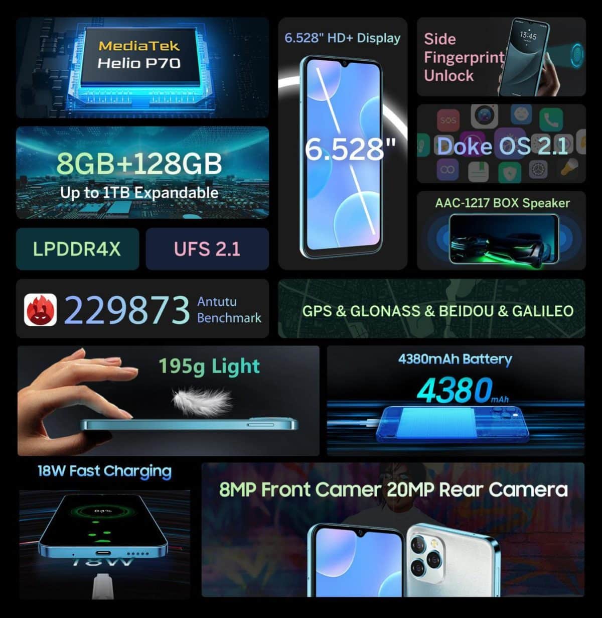 Blackview A100 je mobitel koji predstavlja pravi primjer vrhunskog spoja elegantnog dizajna i kvalitetnih performansi. Fotoaparat uređaja s 12MP Sony IMX362, osvojio je srca većine obožavatelja. Ovaj uređaj slovi za pametni telefon s najbržim fokusom i snimanjem u kategoriji uređaja ispod 300 dolara. Također, dolazi s ultra-wide-angle kamerom od 8 MP pogodnom za snimanje grupnih fotografija. Mobitel pokreće osmojezgreni procesor MediaTek Helio P70, a sadrži i 6 GB LPDDR4X RAM-a, UFS 2.1 128 GB ROM-a, Doke OS 2.0, 6,67-inčni FHD+ zaslon, bateriju od 4680 mAh te NFC.