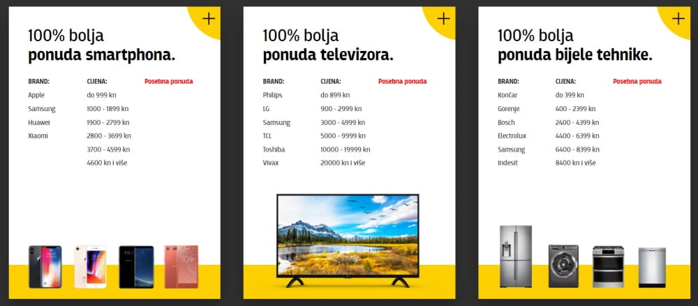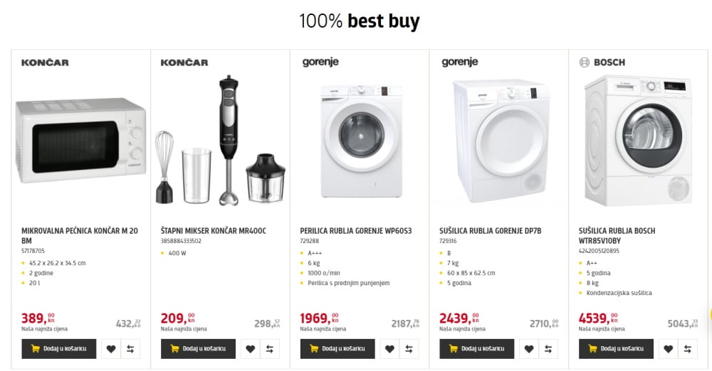 U svakoj kategoriji proizvoda nalazi se već spomenuti filter ‘Akcije i popusti’, koji je beskoristan jer su po njemu svi proizvodi na popustu. Srećom, na početnoj stranici krupno je istaknut banner ‘100% bolja ponuda smartphona’ kojeg prati isto tako ‘100% bolja ponuda televizora’ te odmah potom ‘100% bolja ponuda bijele tehnike’. Ako kliknete na ‘posebna ponuda’ unutar tih bannera, vidjet ćete da iza toga ne stoji ništa. Niti jedan smartfon nije na posebnoj ponudi, ali jest jedan televizor i ukupno pet komada bijele tehnike. Još nešto niže dočekao me je ‘best buy’ odjeljak. Ispostavio se istim kao i ‘posebna ponuda’ bijele tehnike, uz dodatak štapnog miksera.