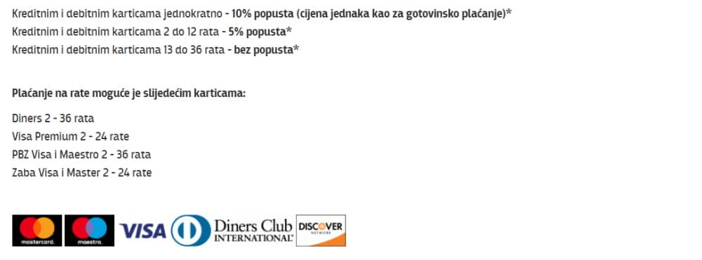 Svu kupnju putem webshopa moguće je platiti pouzećem, pri čemu ostaje 10% popusta za gotovinsko plaćanje. Istih 10% popusta vrijedi za plaćanje kreditnim i debitnim karticama. Ako želite plaćati u ratama, podržane su sljedeće opcije:
