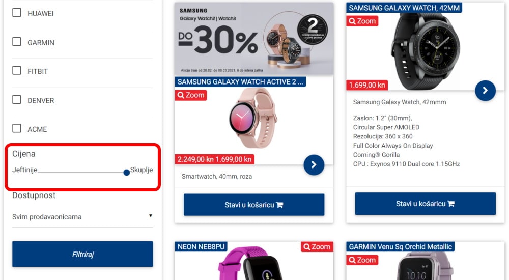 Filter za traženje proizvoda po kategorijama je beskoristan. Prvo sam pretraživao televizore, gdje sam ostao zatečen slabašnim mogućnostima filtriranja, bez ikakvih naprednijih opcija. Cijena se, recimo, ne može tražiti ciljano. Mora se koristiti neprecizni slider, koji će za rezultat dati puno toga što vas uopće ne zanima. Kod mobitela, koji su još kompleksnija roba, situacija je još lošija. Nudi se filtriranje po proizvođaču, po već opisanom slideru za cijenu i po dostupnosti u trgovinama. Dijagonala ekrana, njegova rezolucija, tip zaslona, kamere, čipset, radna memorija, interna memorija, baterija, vrsta punjenja… Sve su to kategorije koje uopće ne postoje. Slična situacija je i s ostalim proizvodima.