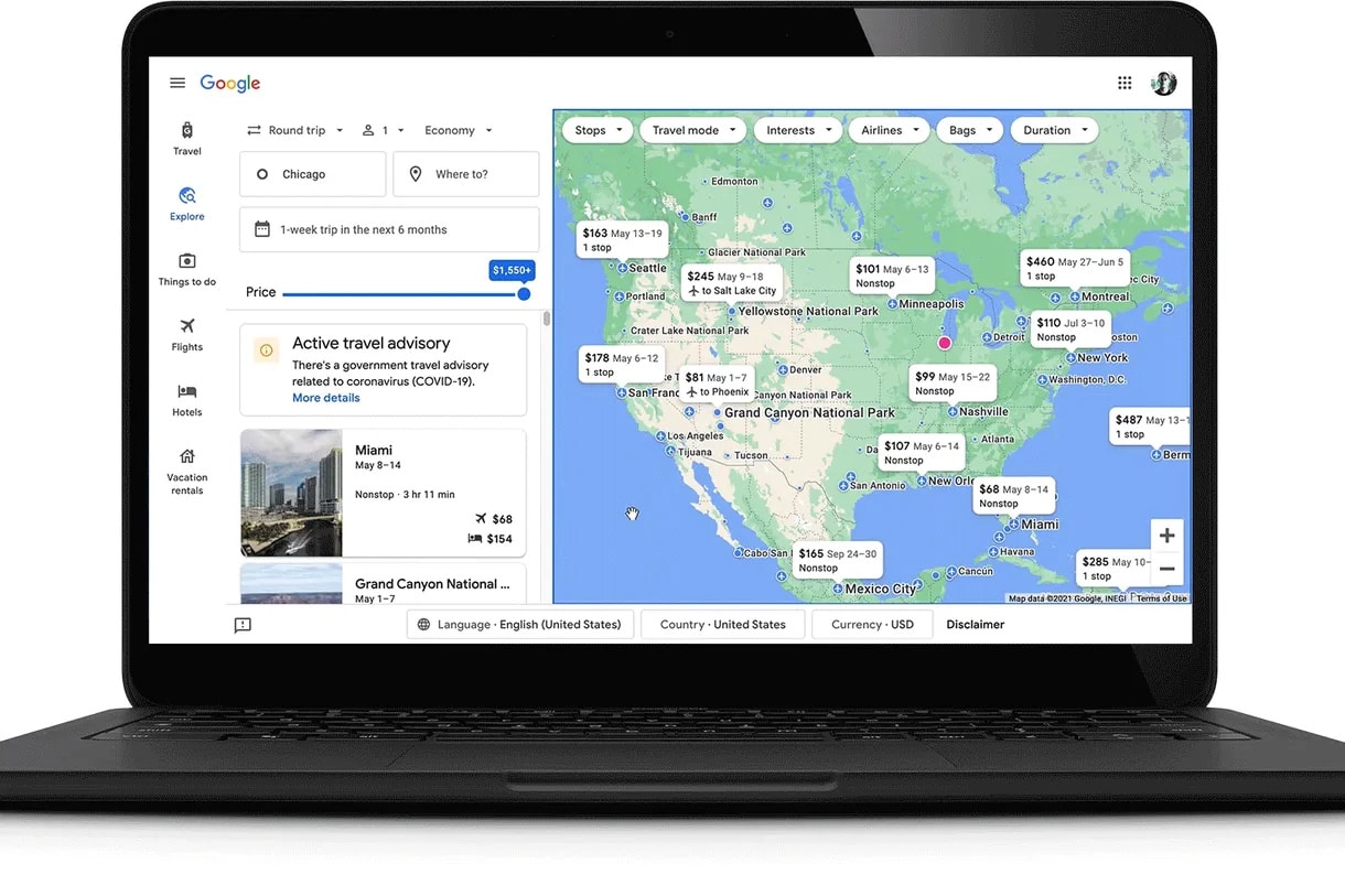 Na “explore” tabu na Googleovoj stranici za putovanja, ljudi mogu pretraživati ne samo letove, već i filtrirati destinacije prema interesima, poput plaža ili skijanja. Kad odaberete odredište, dobit ćete i ažurirane informacije o svim preporukama ili ograničenjima.