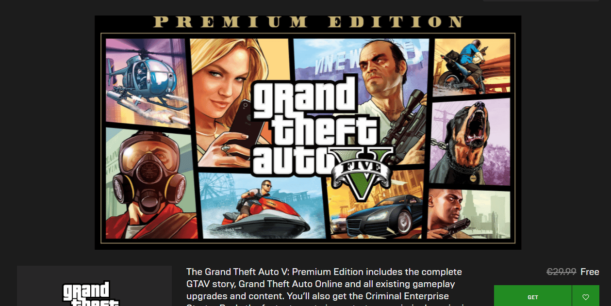 Epic Games je objavio da će GTA V biti besplatan za preuzimanje do 21. svibnja u 17 sati po srednjoeuropskom vremenu. Do lansiranja ove akcije gotovo nitko nije znao o kojem se naslovu radi, ali je Epic na svom službenom Twitter profilu objavio da je u pitanju GTA V. Kad je došlo do otvaranja Epic Games trgovine i ove akcije, zbog prevelikog broja ljudi koji su htjeli preuzeti besplatno ovu igru, platforma je pala i privremeno prestala s radom.