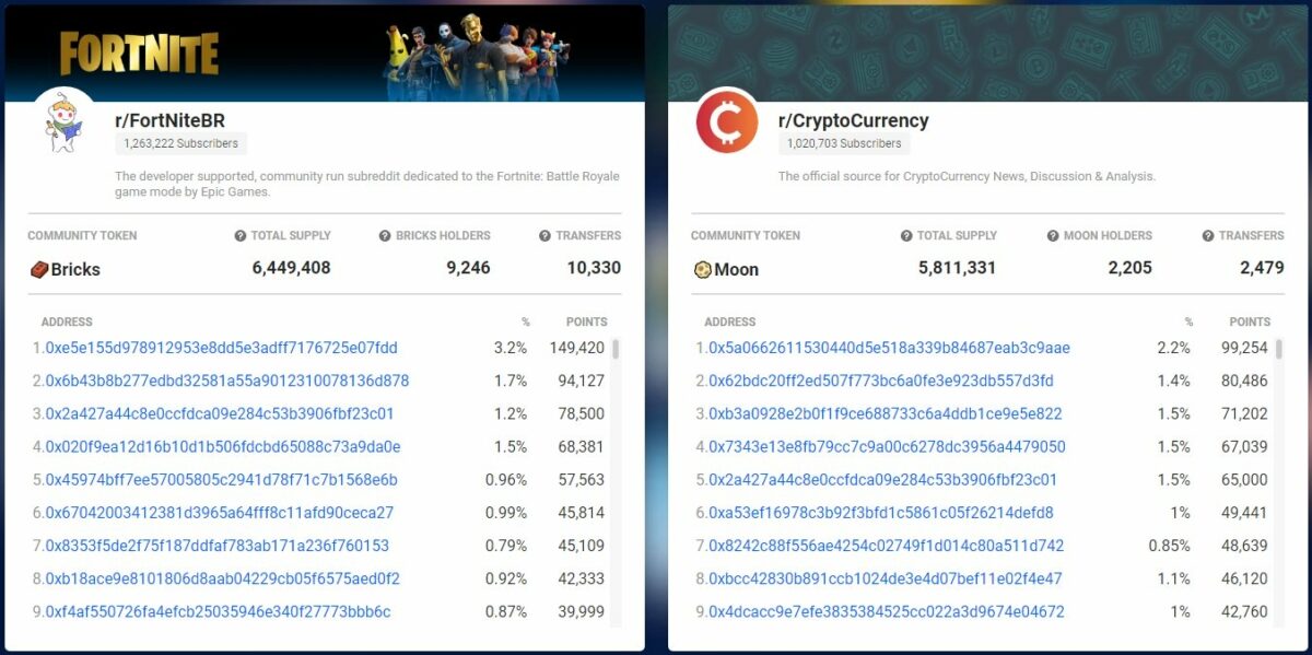 Riječ je o “Community Points”, koji se temelje na novoj valuti koja je prvo predstavljena u okviru dva subreddit-a: r/cryptocurrency i r/FortniteBR koji imaju preko dva milijuna korisnika. Fortnite igrači su pokazali veći interes, pa je registrirano 9.246 novčanika za Reddit “Bricks” coine, dok su korisnici r/cryptocurrency subreddit-a registrirali tek nešto preko dvije tisuće novčanika za „Moons“ coine, piše Decrypt.
