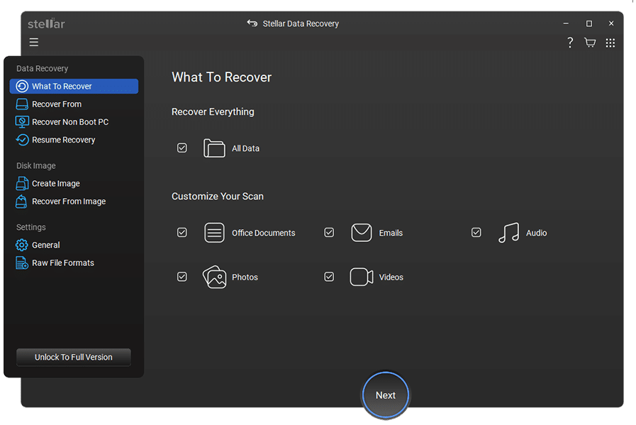 Nakon pokretanja Stellar Data Recovery softvera, prvi korak je odabir vrste podataka koje želite oporaviti. Program omogućuje selektivan oporavak, što znači da možete birati između različitih kategorija, poput dokumenata, fotografija, videozapisa, e-mailova ili arhivskih datoteka. Ova opcija pomaže u optimizaciji skeniranja, smanjujući vrijeme potrebno za pronalaženje izgubljenih podataka. Ako niste sigurni koje su vrste podataka obrisane ili izgubljene, možete jednostavno odabrati opciju “Sve datoteke” kako biste osigurali maksimalni povrat podataka.