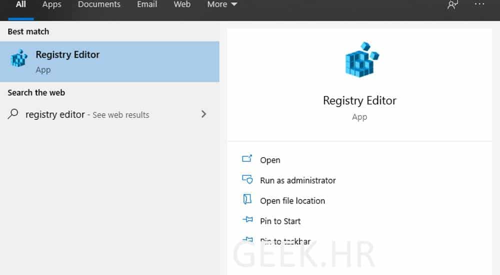 Start Menu Search još je jedna opcija za pozvati Windows Registry Editor. Kliknite na Search ikonu, i kada se pojavi okvir za unos teksta, utipkajte Registry Editor. Kada se pojavi Registry Editor, kursorom miša kliknite na njega, i potvrdite na UAC upit sa Yes.