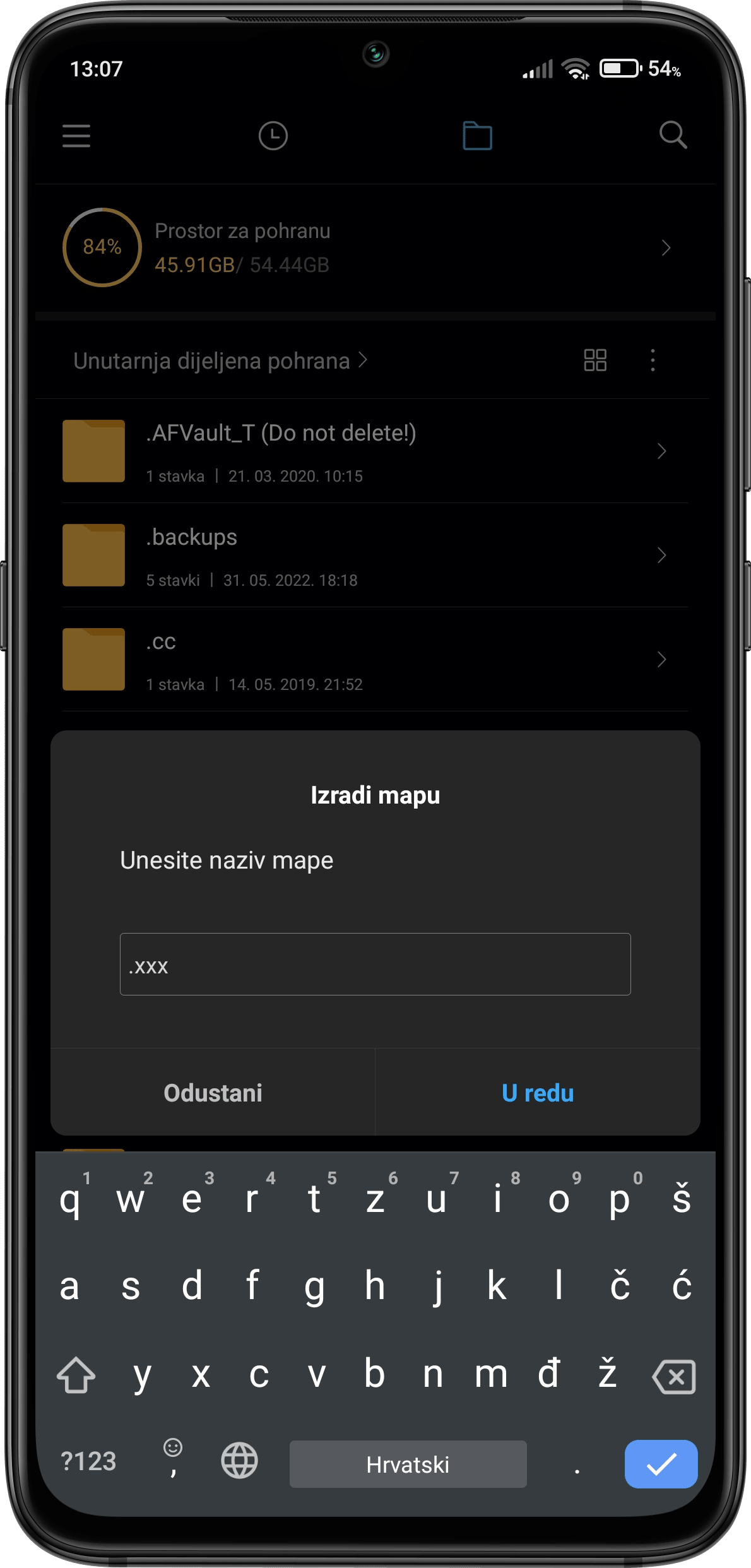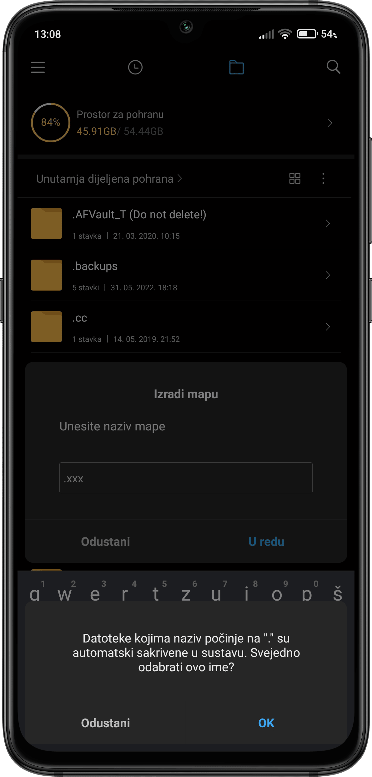 Sve što trebaš je napraviti posebnu skrivenu datoteku. U File Manageru svog mobitela (naći ćeš ga i pod ‘Upravitelj datoteka’) kreiraj novu datoteku, čije ime mora početi s točkom. Svejedno je kako ćeš datoteku nazvati, bitno je da je prvi znak točka. Primjerice, može se zvati .mojvideo ili .skriveno ili što ti već padne na pamet.