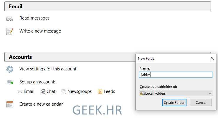 Folder za arhivu stavite kao pod-mapu Lokalnih foldera “Local Folders”.