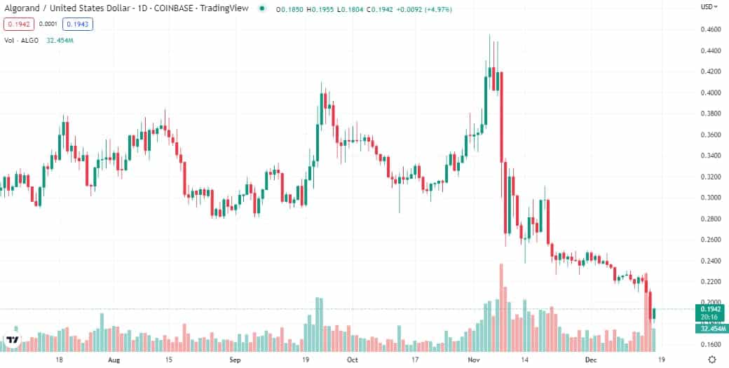 ALGO se trenutno trguje na 0,2234 USD nakon što je prije nekoliko sati dosegnuo najnižu vrijednost od 0,2014 USD. Coin ima pozitivne izglede do kraja 2022. godine, a za očekivati je njegov daljnji rast u 2023. godini.