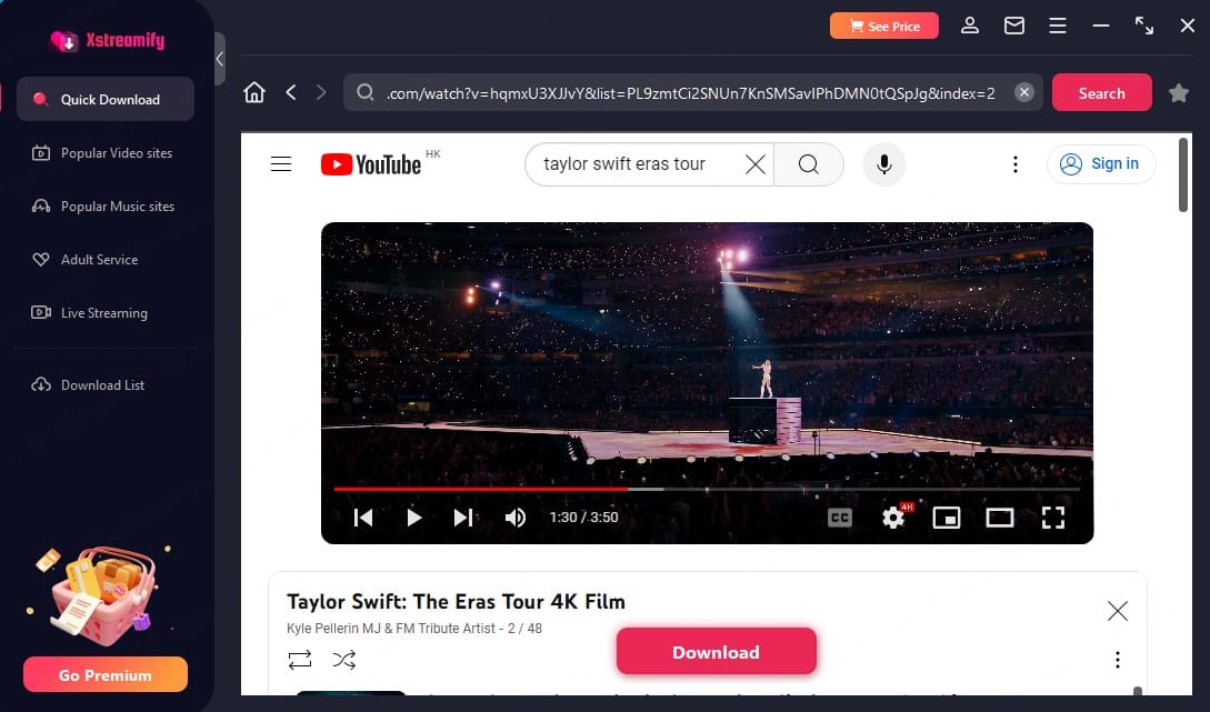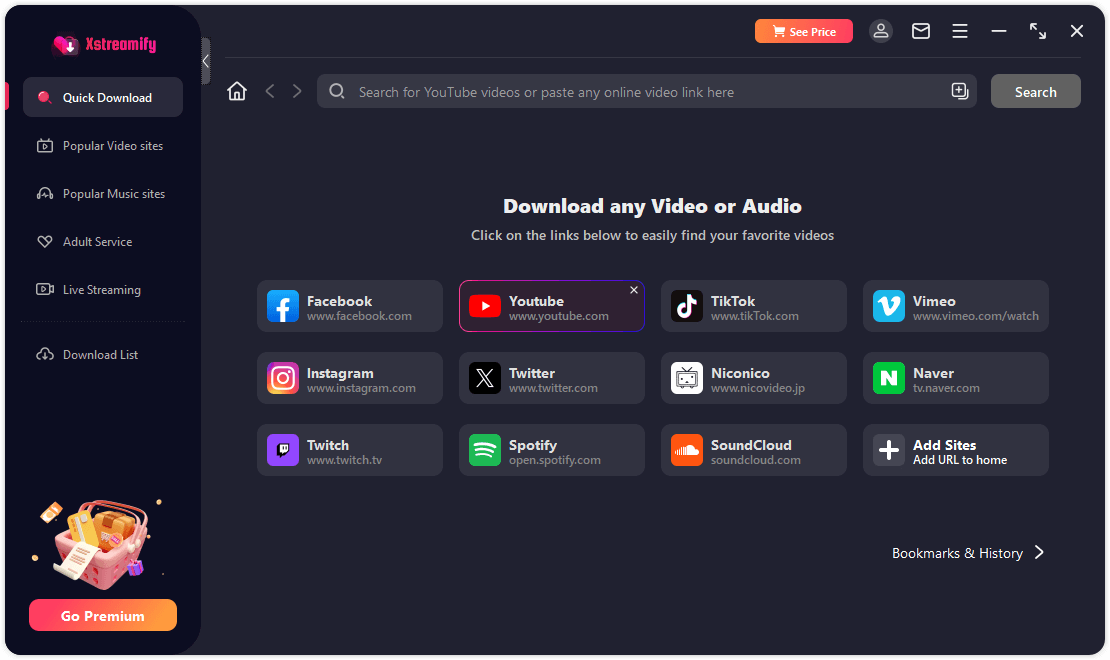 Korak 2. Otvorite Xstreamify i jednostavno zalijepite YouTube URL u za to predviđeno polje, ili kliknite na ikonu “YouTube” kako biste pretražili videozapise koje želite preuzeti.