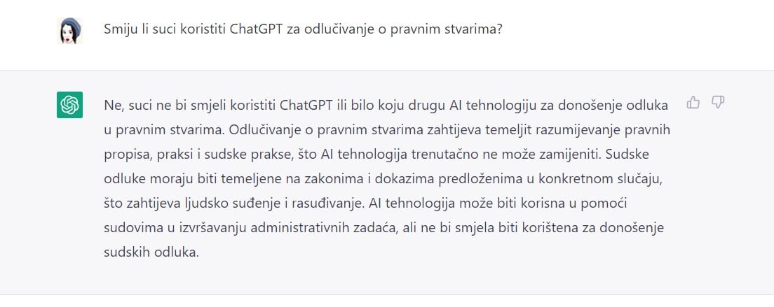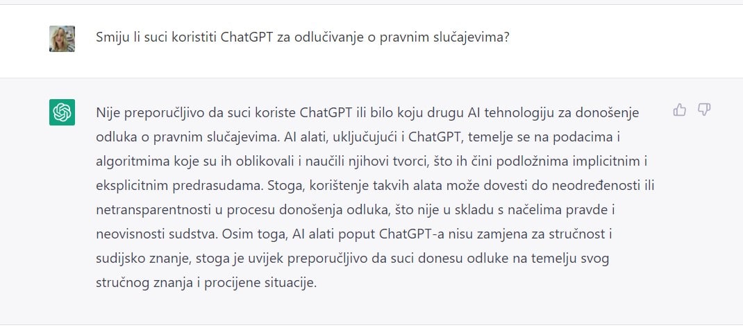 Konačno, treba uzeti u obzir da ChatGPT nije previše siguran u svoje vještine rješavanja problema. Kad smo AI chatbot upitali smiju li suci koristiti platformu za odlučivanje o pravnim slučajevima, nismo dobili potvrdni odgovor. Spominje se da “iako modeli umjetne inteligencije poput ChatGPT-a mogu pomoći u prikupljanju informacija i istraživanju, oni nisu sposobni donositi pravno obvezujuće odluke i nemaju ovlasti tumačiti i primjenjivati zakon”.