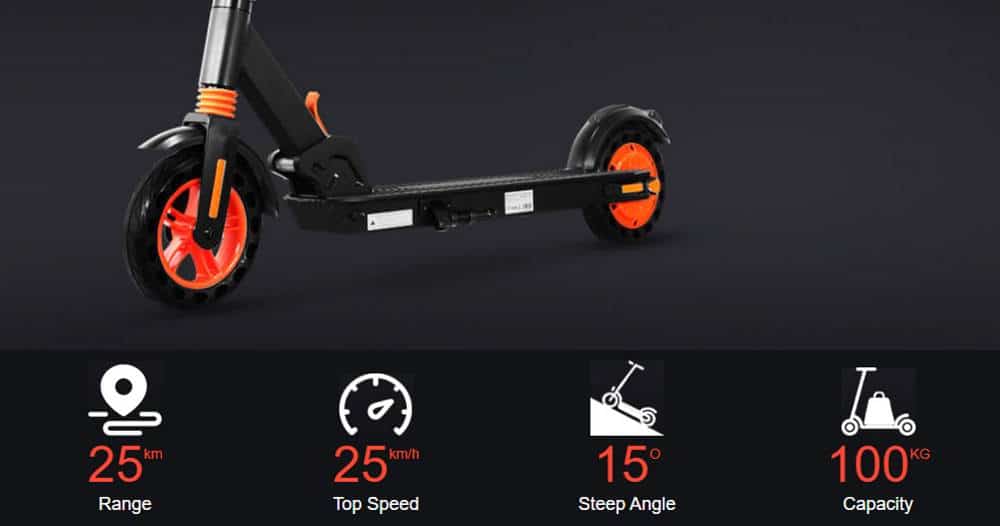 KUGOO KIRIN S1 električni skuter sa 8“ kotačima, 350W DC električnim motorom, i kontrolom 3 različite brzine. Skuter postiže maksimalnu brzinu od 25km/h, i maksimalni domet od 25 kilometara.