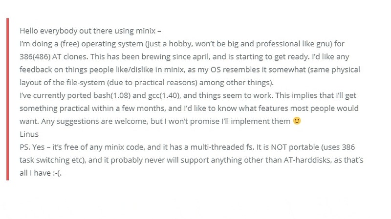 Prije 29 godina, 25. kolovoza 1991. godine, 21-godišnji student Linus Benedict Torvalds predstavio je na comp.os.minix.news grupi svoj rad na besplatnom operativnom sustavu slobodnom od patenata za 386(486) AT klonove. Također, izjavio je da to radi iz hobija.