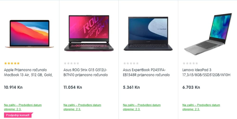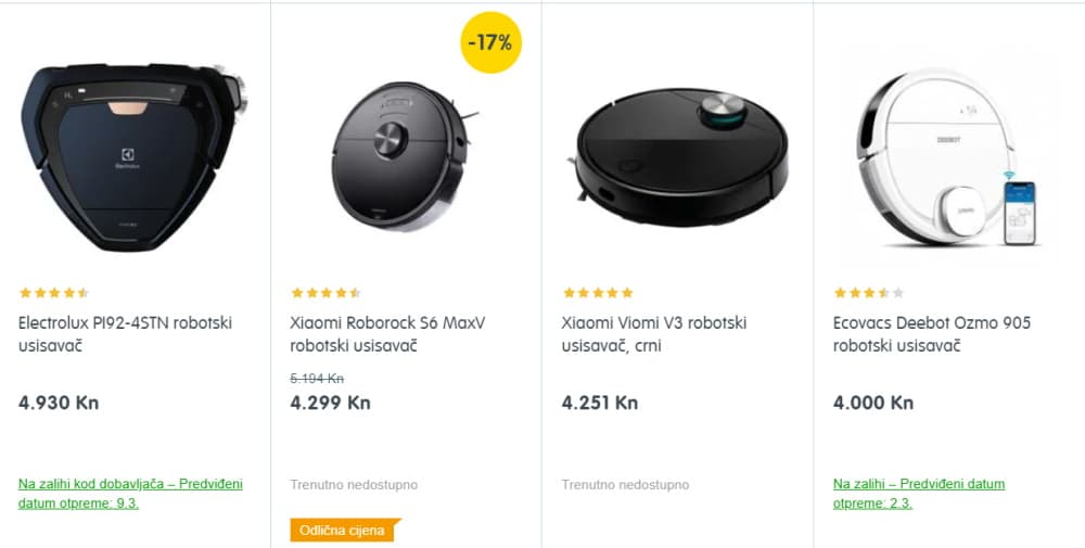 Ako ste u potrazi za laptopom, eno HP 250 G7 za nešto sitno ispod 4 tisuće kuna. Ima predinstalirane Windows 10 OS, desetu generaciju i3 procesora i SSD disk, zbog čega je odličan izbor za univerzalni kućni komp. Ponuda klasičnih računala je nešto slabija što je razumljivo. Svejedno ćete među 60-ak ponuđenih modela naći itekako dobar stroj. Bijele tehnike ima u gotovo nepreglednim količinama: tu su perilice, sušilice, hladnjaci, nape i, najbitnije od svega, vinske vitrine. 🙂 Pregledajte robotske usisavače, jer odlično čiste kuću i uvelike štede vrijeme. Među njima ističem Roborock, jer njihov model S5 više od dvije godine imam u kući i prava je zvijer. Vidim da Mall.hr u ponudi ima sljedeću generaciju (S6), koja je još naprednija i s preciznijim senzorima.