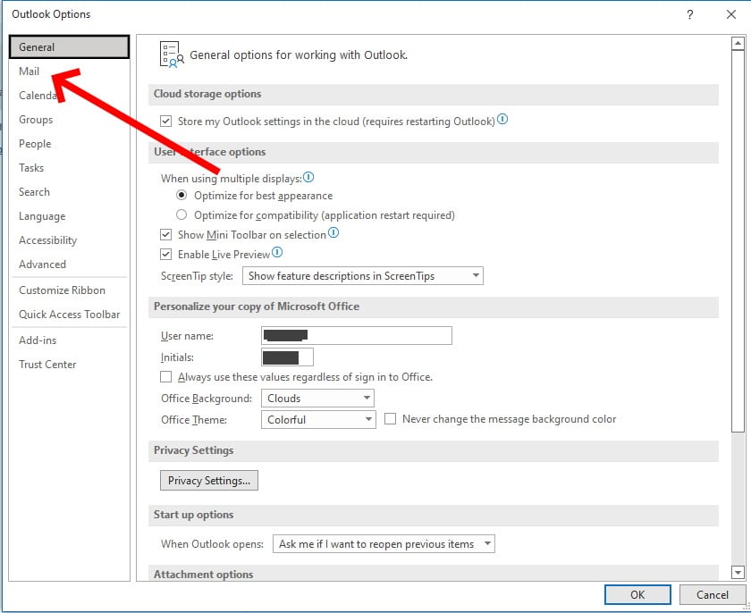 Trenutno se nalazite u kartici ‘General’, ali nama je potrebna kartica ‘Mail’. Kliknite na nju.