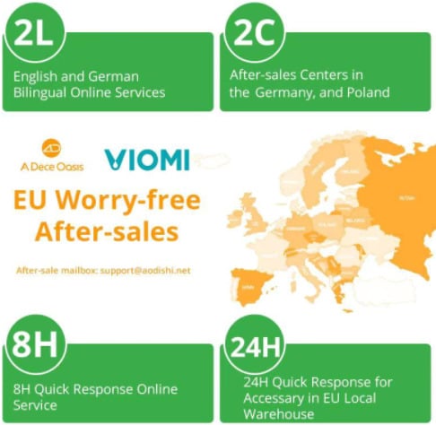 Kako bi pružila bolju podršku nakon prodaje, službena trgovina VIOMI Aliexpress postavila je tehnički servisni centar u industrijskom području Bruchsal (Baden-Württemberg, Njemačka), sa skladištem od 3.000 kvadratnih metara i uredom od 400 kvadratnih metara. Osim toga, dva druga centra za održavanje u Njemačkoj i Poljskoj trenutno prate zahtjeve kupaca za popravkom u Europi.