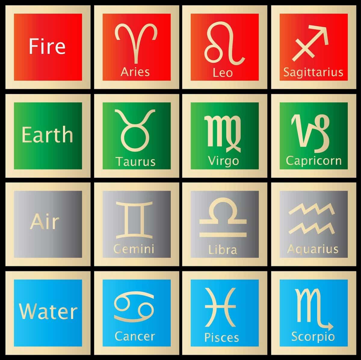 Dvanaest znakova zodijaka podijeljeno je u četiri skupine: voda, vatra, zemlja i zrak. Element pod kojim se nalazi vaš horoskopski znak može utjecati na vas i vašu osobnost. Vodeni znakovi su rak, škorpion i ribe. Vatreni znakovi su ovan, lav i strijelac. Pod zemljane znakove ubrajamo bikove, djevice i jarce, a zračni znakovi su blizanci, vaga i vodenjak.