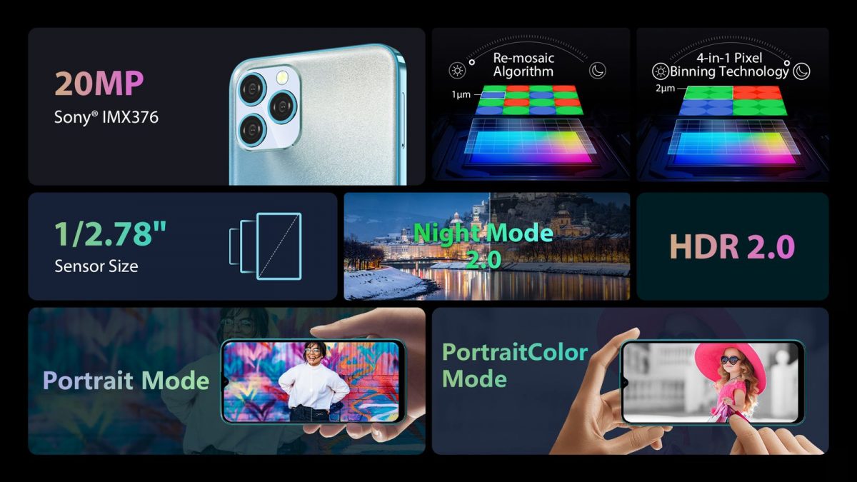 Svi ljubitelji fotografije bit će oduševljeni sa senzorom Sony® IMX376 od 20 MP koji čak i pri slabom osvjetljenju daje snagu svakoj fotografiji. Zahvaljujući tehnologiji spajanja piksela 4-u-1 i algoritmima ponovnog mozaika, fotografije su noću super svijetle, a danju ultra jasne. Kombiniranje softverskih algoritama kamere, uključujući Super Night Mode 2.0, HDR 2.0, Portrait Mode i PortraitColor Mode, koje je nadogradio Blackview R&D Team, iskustvo fotografiranja nikada neće biti isto.