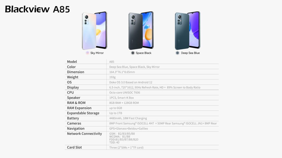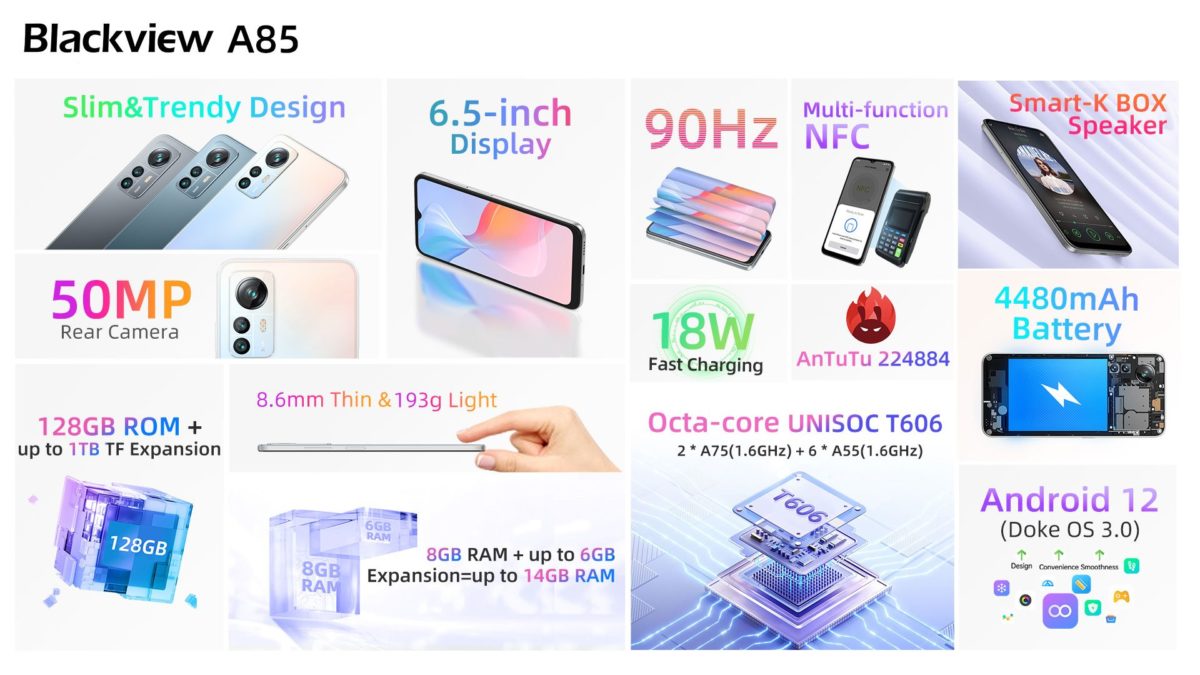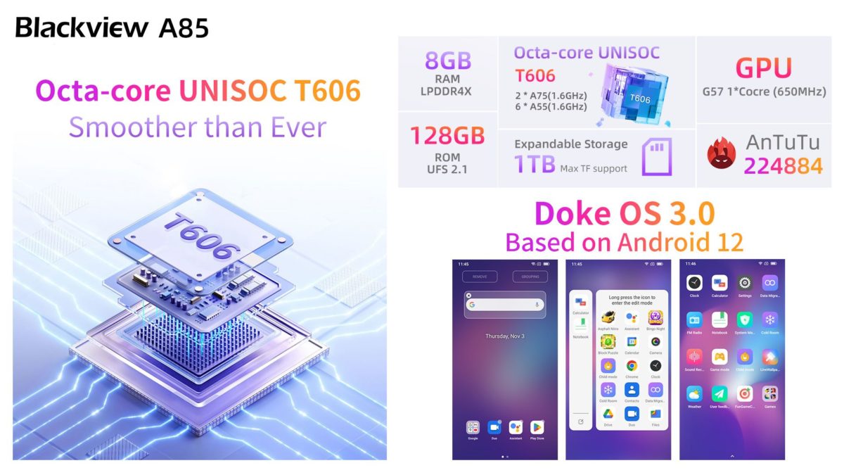 Kada govorimo o procesoru, očekuje se da će Blackview A85 imati osmojezgreni UNISOC T606 s 8 GB RAM-a i do 6GB memorijskog proširenja za bržu i učinkovitiju obradu zadataka i fluidniji rad za multitasking. U usporedbi s ograničenim kapacitetom pohrane prosječnih mobitela, Blackview A85 nudi proširenje svoje memorije do 1 TB s TF karticama uz zadani ROM od 128 GB.