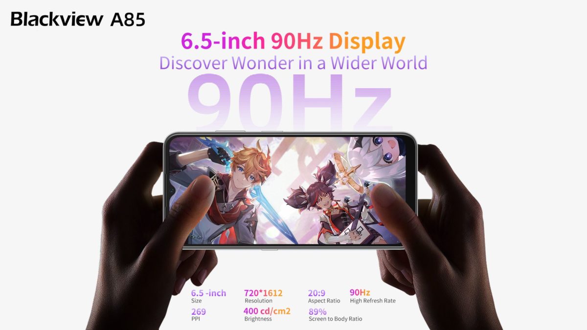 Blackview A85 opremljen je 6,5-inčnim 90Hz zaslonom praktičnim za rad, ali i gledanje filmova. U usporedbi sa zaslonom od 60 Hz kojim je većina današnjih mobitela opremljena, konfiguracija ovog telefona nudi 50% kvalitetniji prikaz. Visoka stopa osvježavanja očito je poboljšanje korisničkog iskustva, pruža stabilniji prikaz slike, bolju fluidnost u brzoj promjeni slika te jasnije performanse slike za korisnike.