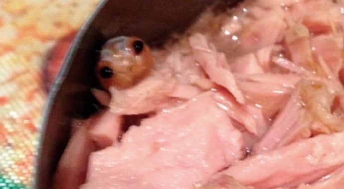 Zoe Butler (28) iz Nottinghama u Engleskoj je fotografirala životinjsku glavu s izraženim očima koju je pronašla u konzervi i poslala žalbu tvornici tunjevine, čija je uprava obećala ispitati kako je do toga moglo doći.