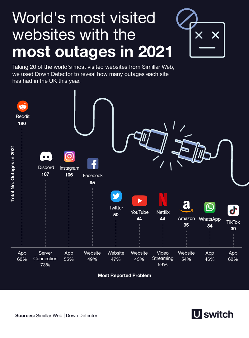 Online forum Reddit na vrhu je britanske liste s nevjerojatnih 180 zasebnih incidenata tijekom ove godine. Gotovo dvije trećine (60 posto) incidenata odnosilo se na probleme s Reddit aplikacijom. Na drugom mjestu u V. Britaniji našao se Discord sa 107 problema (74 posto se odnosilo na pokušaj povezivanja na server), a slijedi ga Instagram sa 106 zasebnih problema, od čega je 55 posto bilo vezano za Instagram aplikaciju. Četvrto mjesto drži Facebook s 95 zasebnih incidenata od čega je 49 posto bilo vezano za probleme s web stranicom.