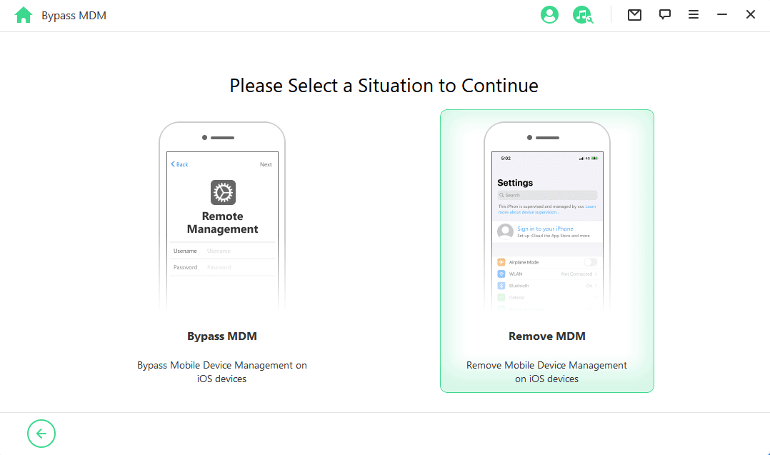 Korak 1: Instalirajte iDelock i zatim ga otvorite. Kliknite na Bypass MDM. Povežite svoj iPhone/iPad s računalom i budite sigurni da vjerujete uređaju.