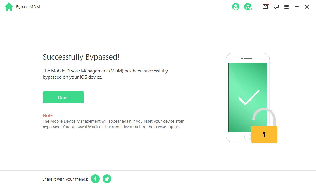 Zapamtite: MDM će se ponovno pojaviti ako resetirate uređaj nakon zaobilaženja, ali uvijek možete otključati isti uređaj s iDelockom prije isteka licence.