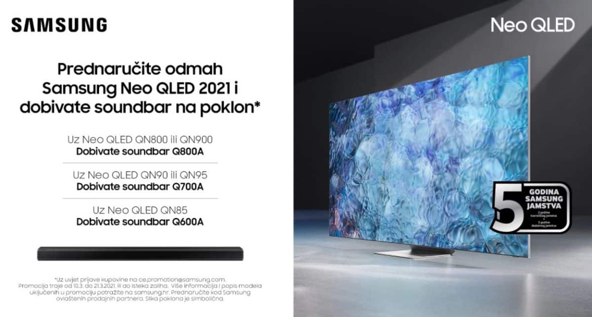 Kupnjom Samsung Neo QLED televizora modela QN900, QN800, QN95, QN90 ili QN85 u razdoblju do 21. ožujka 2021. godine, na poklon ćete dobiti novi Samsung soundbar Q800A, Q700A ili Q600A te produljeno petogodišnje jamstvo na kupljeni televizor. Za ostvarivanje prava promocije potrebno je da se nakon isporuke jednog od gore navedenih Neo QLED modela prijavite za sudjelovanje slanjem poruke na sljedeću e-mail adresu: ce.promotion@samsung.com. Prijavu je nužno izvršiti najkasnije do 30. travnja 2021. godine.