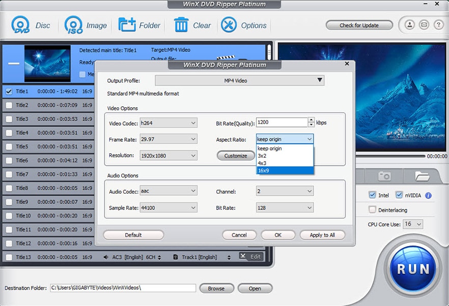 Nakon umetanja DVD-a potrebno je izabrati odredišni format. WinX DVD Ripper Platinum nudi velik broj opcija i na krajnjem korisniku je da odredi hoće li to biti ISO, MP4, format za iOS ili nešto peto.