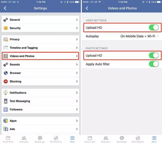 3. korak: Ovdje ćete pronaći opciju uključivanja “Upload HD” za videozapise i fotografije. Ako je uključite za fotografije, moći ćete postavljati HD fotografije na Facebook.