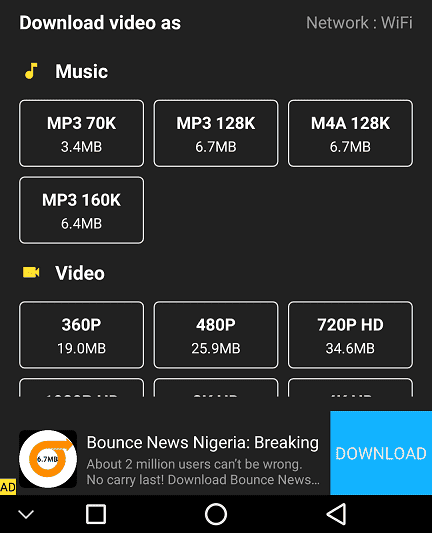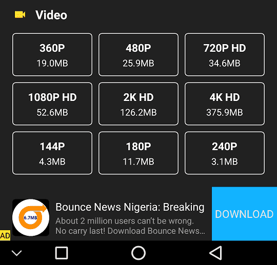 Snaptube vam daje mogućnost odabira rezolucije za preuzimanje videozapisa. Također možete izvući zvuk iz videozapisa. Što je veća rezolucija, to je bolja kvaliteta, ali veći je broj mobilnih podataka koji će biti potrebni za preuzimanje videozapisa.