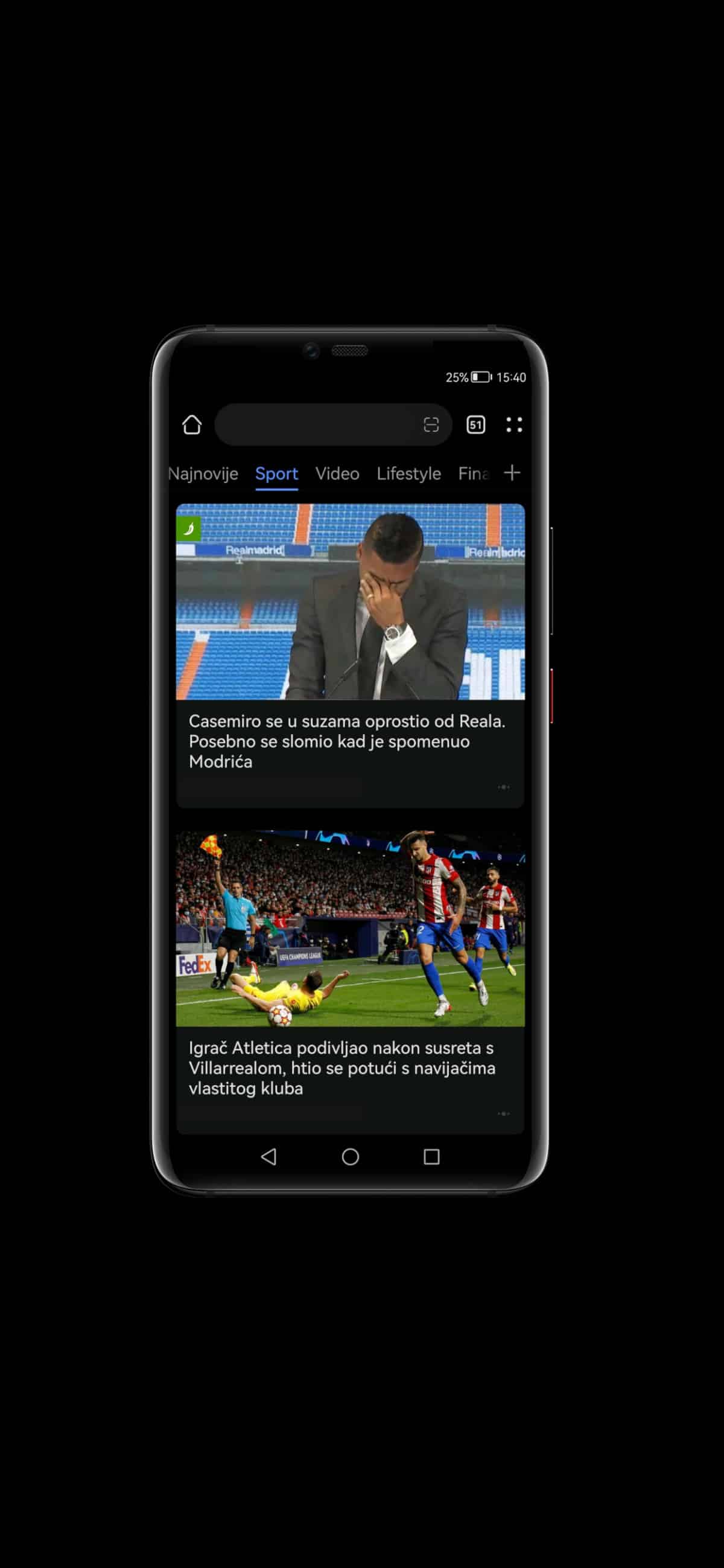 Personalizirana usluga vijesti može se pronaći na početnoj stranici HUAWEI Preglednika gdje možete pronaći razne kategorije, kao što je SPORT. Korisnik se može kretati gornjom trakom i prelaziti između različitih kanala.
