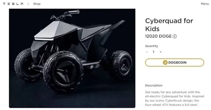 Korištenje spomenute kriptovalute omogućeno je za sljedeće proizvode: Cyberwhistle za 300 Dogecoina (58 USD), Giga Texas Belt Buckle za 835 Dogecoina (161 USD) i Cyberquad za djecu po cijeni od 12.020 Dogecoina (2.320 USD). Treba napomenuti da je Dogecoin sada jedini način za kupovinu tih artikala jer se gotovinska opcija više ne prikazuje.