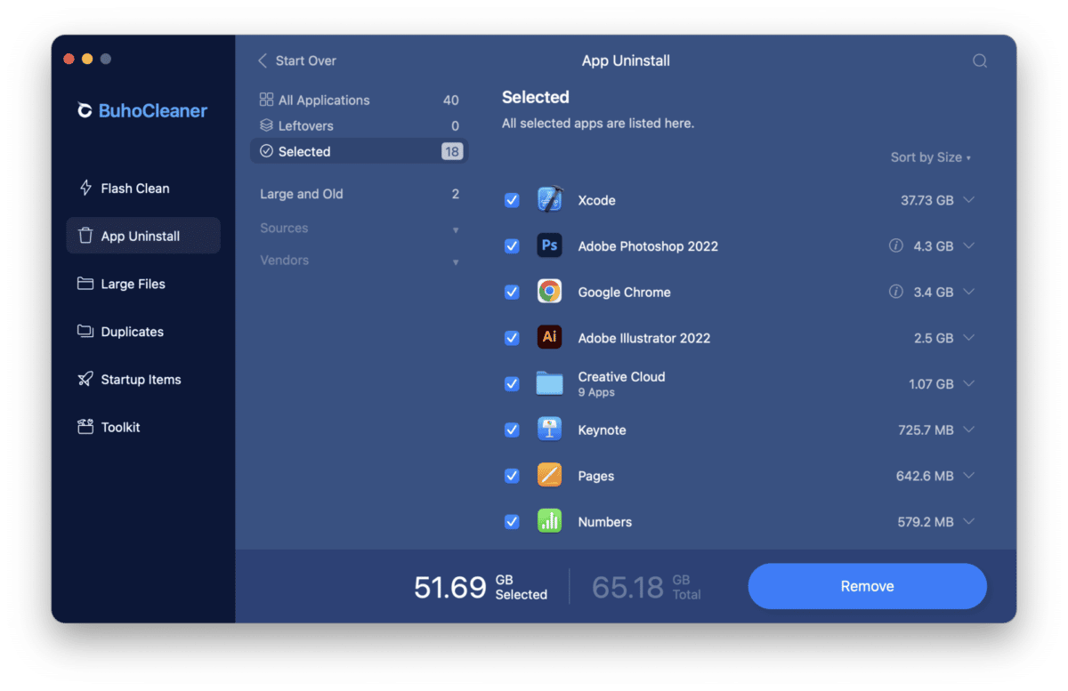 Poboljšanjem točnosti i potpunosti rezultata skeniranja Mac aplikacija, BuhoCleaner donosi nekoliko prilagođenih rješenja za deinstaliranje određenih aplikacija na Apple M2, uključujući Adobe/Office paket aplikacije, Parallel, Spotify, OneDrive, Zoom itd. Novi filter aplikacija i značajka grupiranja dodaju jednu mogućnost pomoći korisnicima da lako pronađu ove tvrdoglave, prenapuhane i druge vrste neželjenih aplikacija.