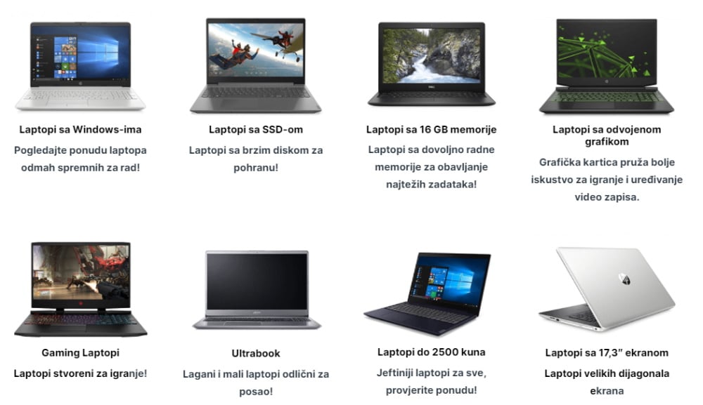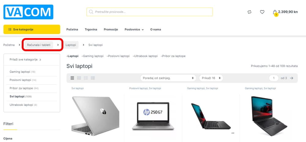 Kategorije su tako neobično dizajnirane, da ćete odabirom jedne te iste kategorije, dobiti sasvim drugačiju ponudu. Zvuči zbunjujuće, u praksi je isto tako. Ako kliknete glavnu kategoriju ‘Laptopi i tableti’ prikazat će vam se stranica s popisom laptopa po karakteristikama (s Windowsima, sa SSD-om i slično), ali bez ijednog tableta. Ako otvorite podizbornik (prijeđite pokazivačem preko ‘Laptopi i tableti’) i kliknete prvu opciju ‘Laptopi’, e tada ćete dobiti popis svih laptopa. Ali ako bacite oko na sliku ispod ovog pasusa, primijetit ćete da su laptopi odjednom postali podkategorija u ‘Računala i tableti’ i klikom na tu kategoriju dobit ćete opet nešto drugo…