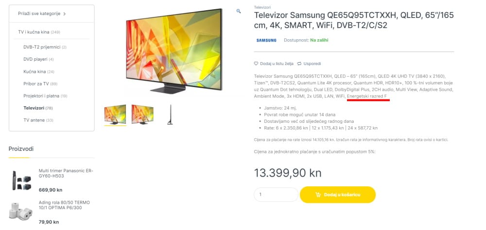 Vacom.hr ima pristojnu ponudu od osamdesetak televizora, mada će ih biti relativno teško pretražiti pomoću filtera. Već sam ga istaknuo kao slabu točku ove stranice, ali tek ovdje dolazi do izražaja koliko je ovaj webshop kilavo napravljen. Po njemu, jedan jedini televizor ima HDMI priključak, a o preciznosti ostalih bitnih stavki ne vrijedi niti pričati. U filteru ih jednostavno nema. Specifikacije se razlikuju od opisa proizvoda jer za isti uređaj daju različite informacije. Što je onda točno? Postoji li ijedna informacija o proizvodima na ovoj stranici u koju se kupac može pouzdati?