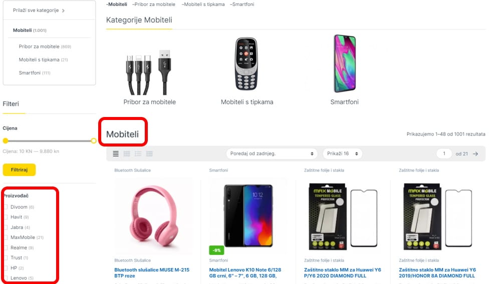 Ohrabren iskustvom s laptopima, kliknuo sam na kategoriju mobitela i shvatio da oznaka kategorije uopće ne mora značiti da ćete u toj kategoriji završiti. Izborom iste kategorije dobiju se ili svi mobiteli, ili samo smartfoni, a možete naletjeti i na slušalice.