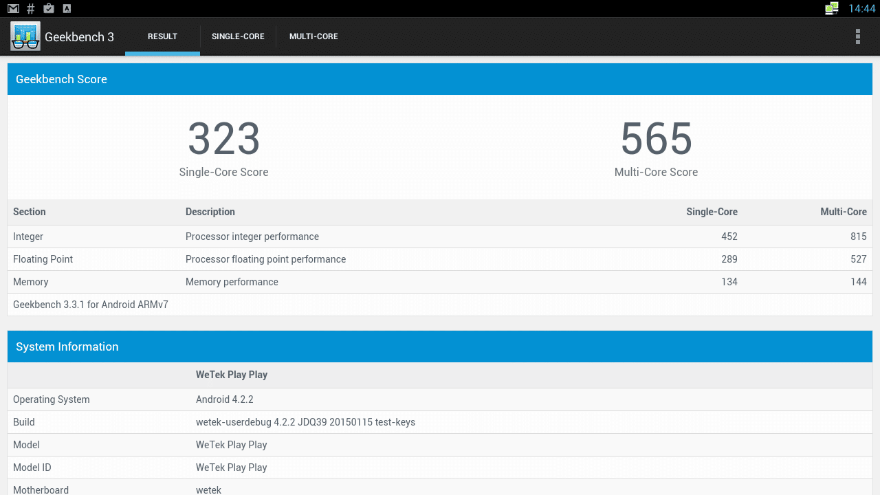 Kao i svaki drugi uređaj pa tako i ovaj sam odlučio testirati s nekoliko benchmark aplikacija čisto da vidim koliko su performanse ovog media playera. Za ove potrebe sam koristio Geekbench 3.0, te sam dodatno čisto radi tehničkih podataka koristio Cpu-z. Pa shodno tome mogu navesti da WeTek Play ima AMLogic AML-8726 MX procesor brzine 1.5Ghz i 1GB ugrađenog RAM-a. Dok ima 4GB unutarnje memorije za pohranu podataka koju možete proširiti npr… s microSD karticom.