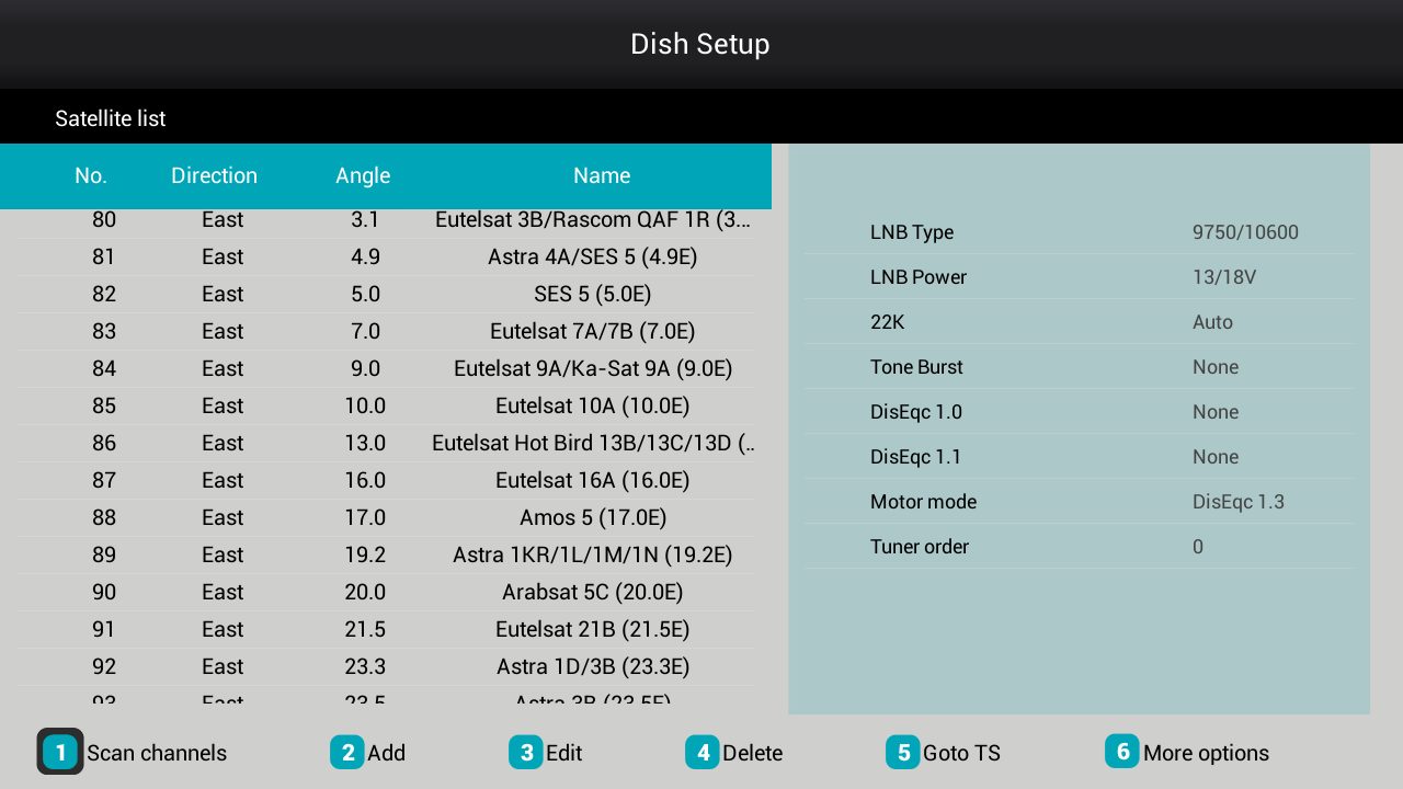 Aplikacija WeTek Theater omoguće gledanje satelitske televizije. Kod prvog pokretanja potrebno je podesiti postavke za vaš satelitski sustav. Odabrati željeni DiSEqC, satelit i sl. Također bih želio navesti da uređaj podržava i motor odnosno DiSEqC 1.2 i DiSEqC 1.3. Nakon što podesite postavke, možete krenuti s skeniranjem željenih satelita.