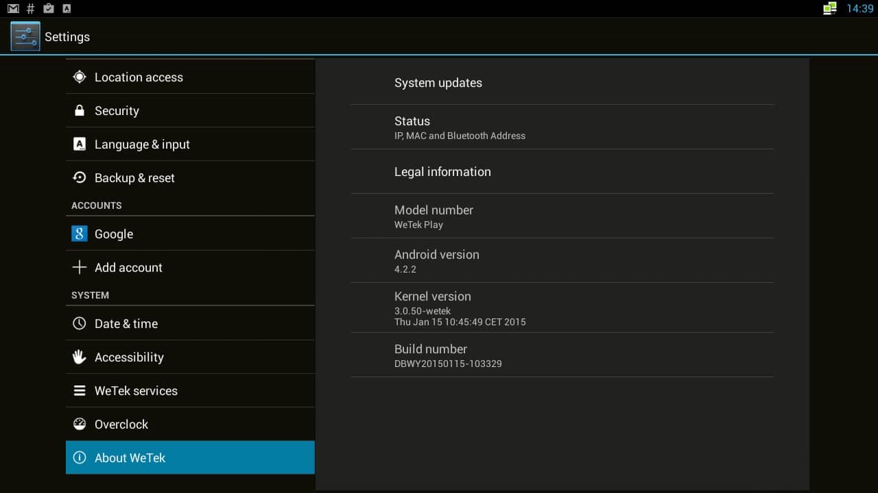 Dolazi s instaliranim Android 4.4.2 sustavom. Korisničko sučelje je djelomično vizualno modificirano. Osim vizualne modifikacije, uređaj dolazi s nekoliko pre-instaliranih aplikacija kao što su Xbmc, MX player i i Kodi. Također na Wetek službenom forumu imate izbor ROM-ova od CyanogenMOD i OMNI. Tu je isto i dostupan OpenELEC, a uskoro možete očekivati i Enigmu 2. Sve u svemu zvuči super! Dok sam sustav je vrlo fluidan i brz i nisam naišao neke probleme tokom korištenja.