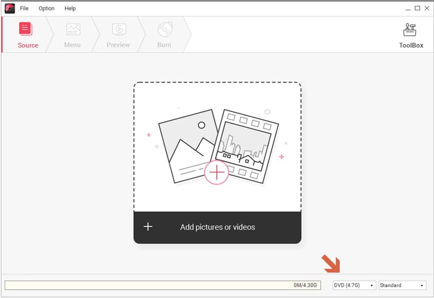 Korak 4: Ako želite snimiti jednostavan DVD bez ovih složenijih, gore navedenih elemenata, u početnom meniju treba samo odabrati “One-Click DVD”. Slijedi tek dodavanje fotografija i/ili videa koje se žele snimiti te još jedan klik na Burn DVD i sav je posao gotov.
