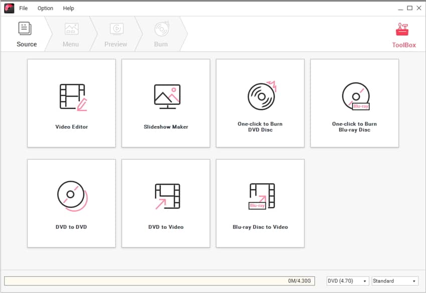 Korak 2: Budući da je primarna namjena ovog programa kreiranje DVD diska, izabrat ćemo prvu opciju. Ugledat ćete ponešto poznatu mogućnost izbora materijala koji se želi snimiti na DVD kao što je recimo MP4 to DVD, a kakvu ste zacijelo već susretali prilikom korištenja drugih programa. Nakon što izaberete ono na što želite snimiti te isto tako izaberete odgovarajući format, pruža se mogućnost predpregleda kako biste bili sigurni da će rezultat biti baš onakav kako ste zamislili. Sve što ostaje jest kliknuti na Burn DVD i dužina trajanja kojeg, naravno, ovisi o količini videa i fotografija koju ste odabrali.
