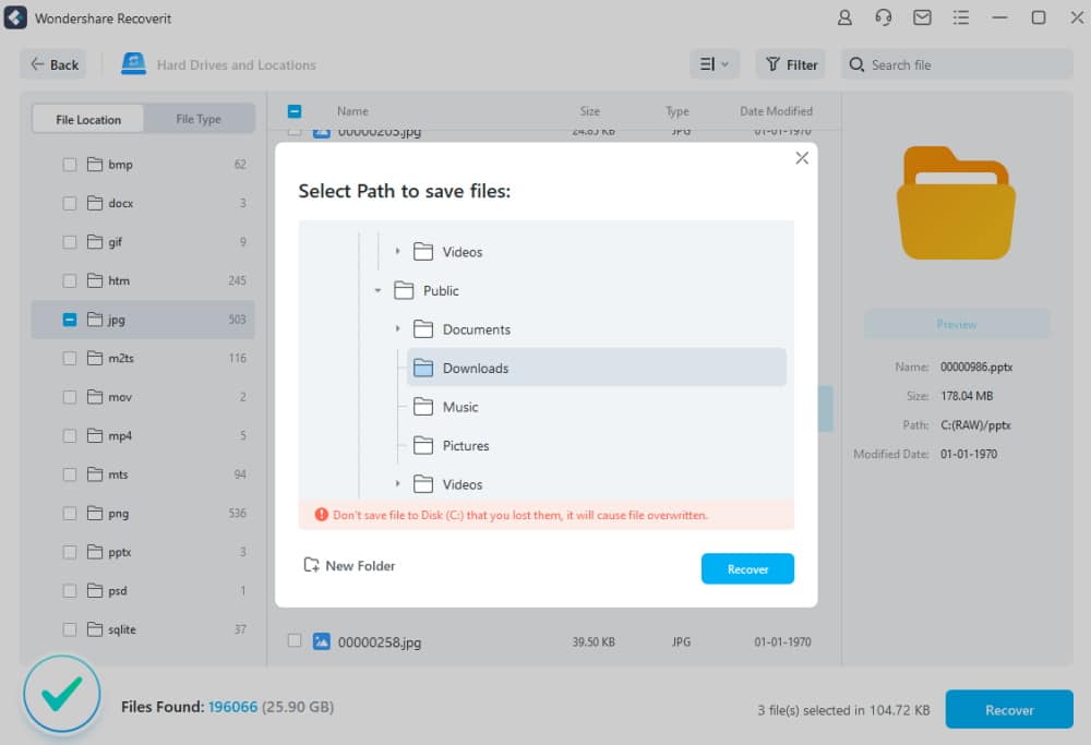 Jedna sigurnosna opaska za kraj pasusa: Wondershare Recoverit tražit će da podatke ne spremate u isti folder u kojem su originalno bili (desktop u mom slučaju), jer postoji mogućnost konflikta i brisanja starog zapisa, zbog čega će ga biti nemoguće spasiti.