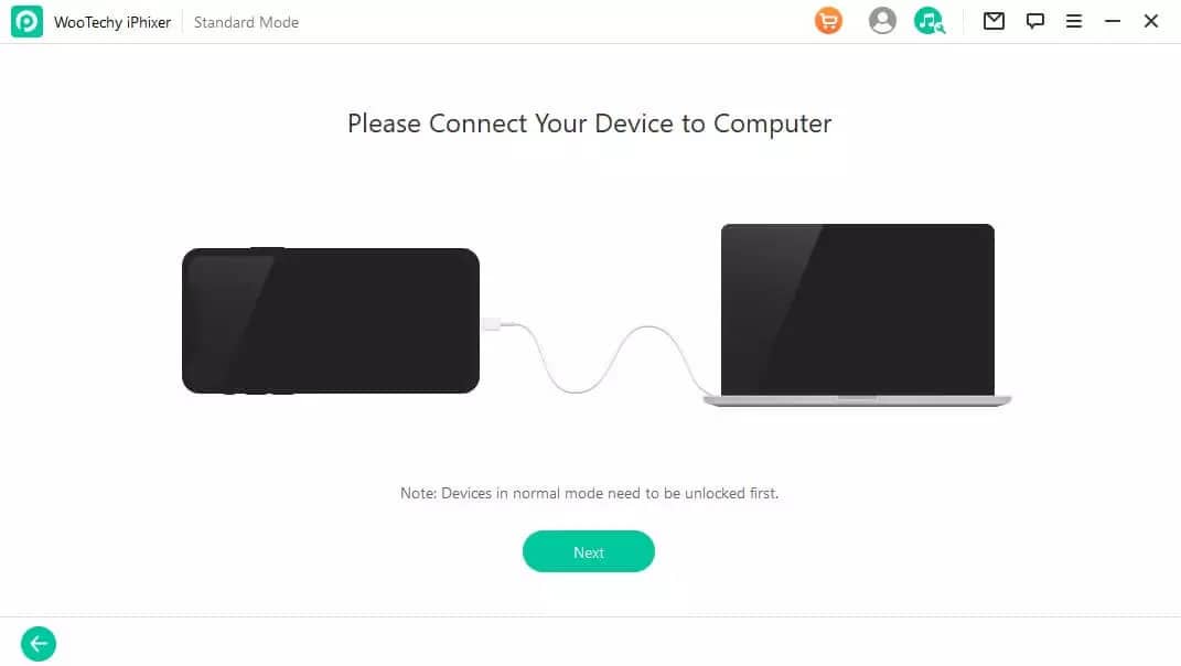 Preuzmite WooTechy iPhixer sa službene web stranice. Nakon instalacije, pokrenite ga na Mac ili Windows PC-u. Odaberite “Standard Mode”, a zatim kliknite gumb “Next”.