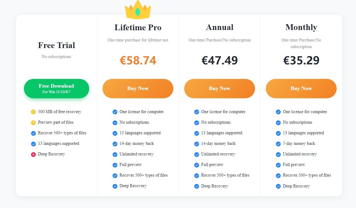Besplatna verzija moći će povratiti do 500 megabajta izgubljenih datoteka, dok Pro verzija neće imati ograničenje. Također, besplatna verzija ne nudi preview, odnosno pregled datoteke koju vraćate, a pregled videa funkcionira samo za njegovih prvih 15 sekundi. Besplatnu verziju nije moguće niti nadograditi, a isto tako, korisnička podrška omogućena je samo za Pro korisnike.